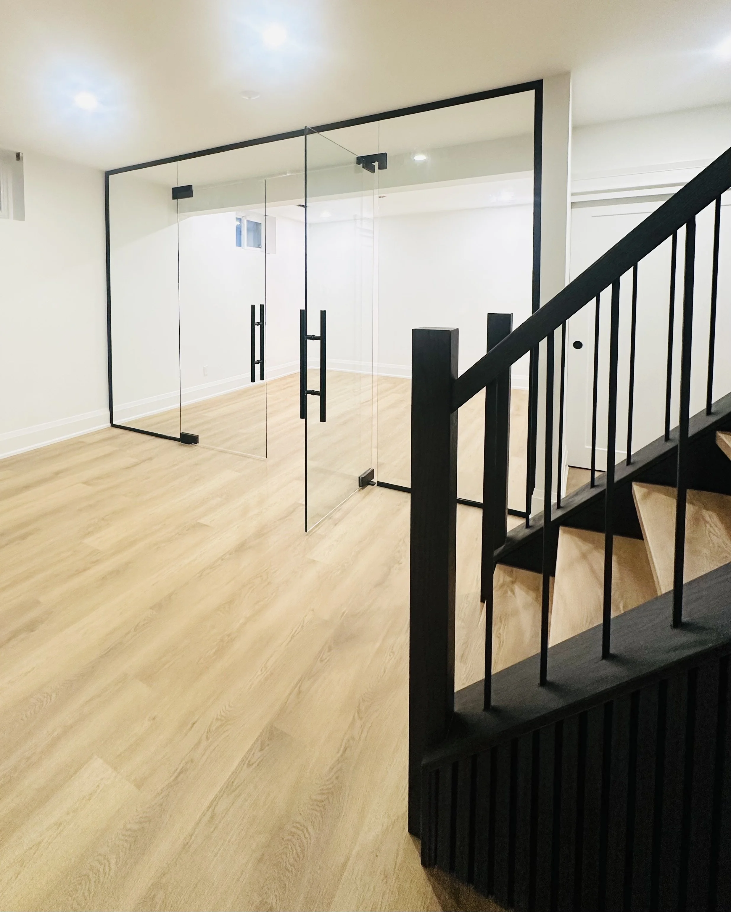 The bold black finish naturally highlights the hardwood steps and flooring throughout the home, while also enhancing lighting and complementing hardware finishes across the space.PIVOT