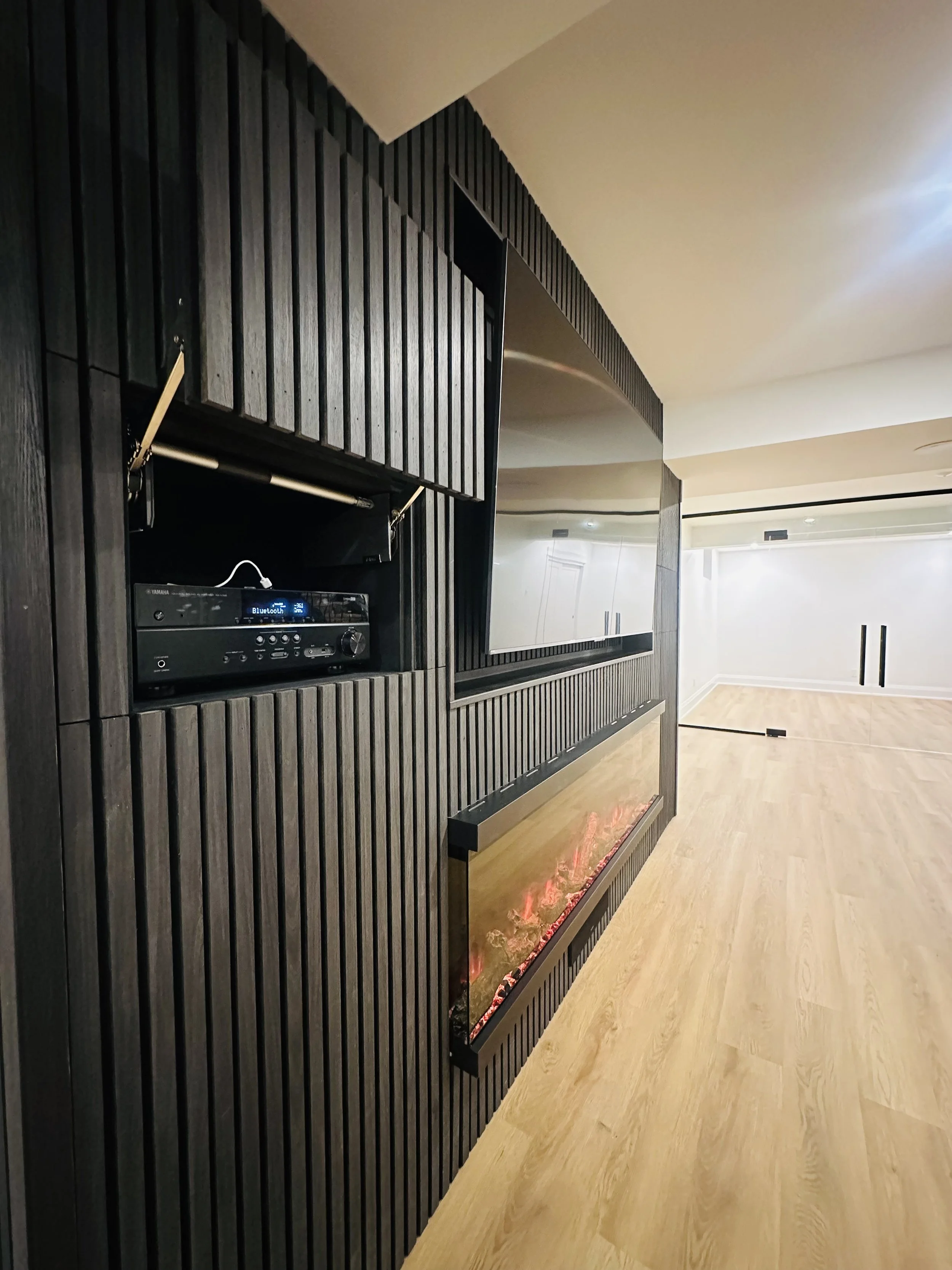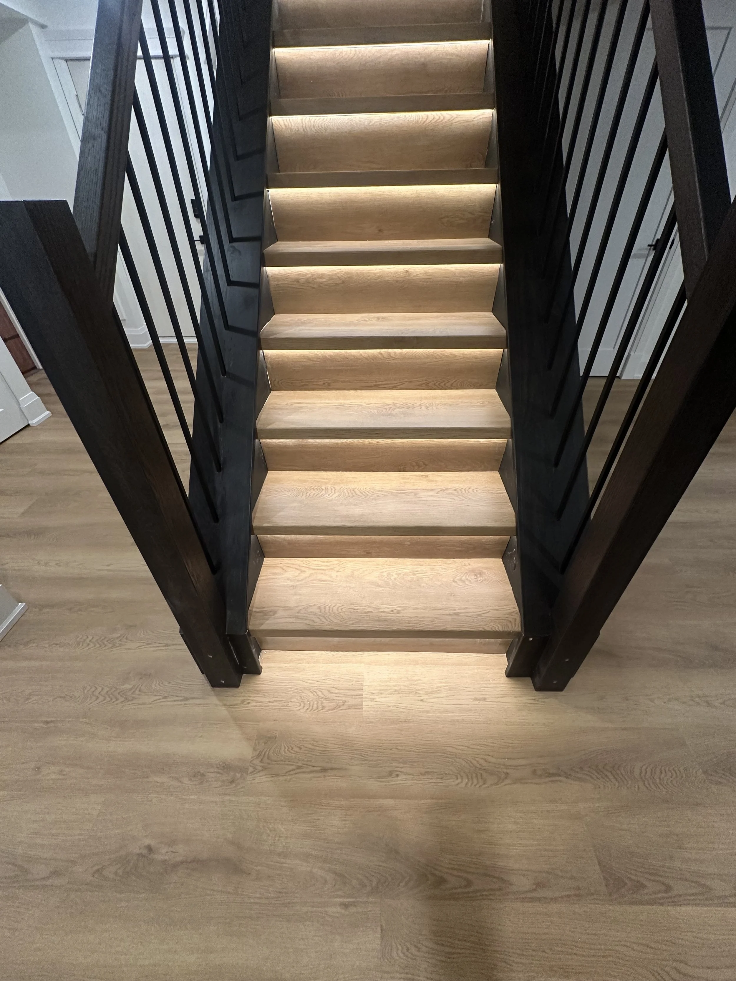 The contrast between black risers and hardwood stair treads creates a striking statement upon entry. This design has become highly sought after, as black staircase risers elevate the space with a sense of quiet luxury.